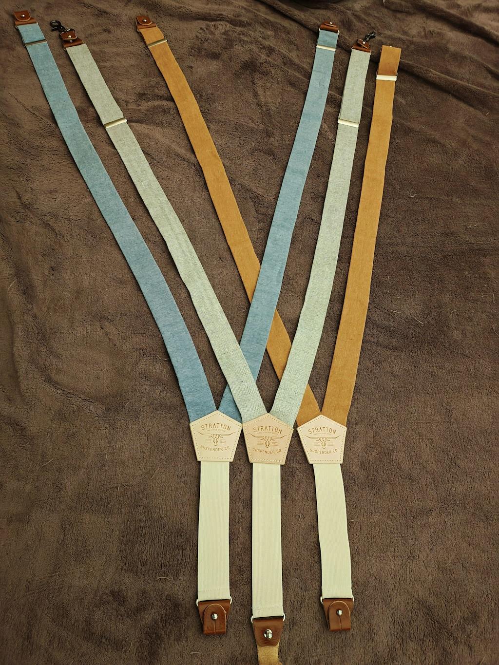 Every strap set is handmade-to-order by a husband-and-wife team in Uvalde, Texas. We cut, sew, and finish each strap using premium linen and heirloom-level construction to match the quality of your original Stratton Suspenders. Because we make each order individually, no two strap collections are exactly alike—and we can often accommodate special requests.