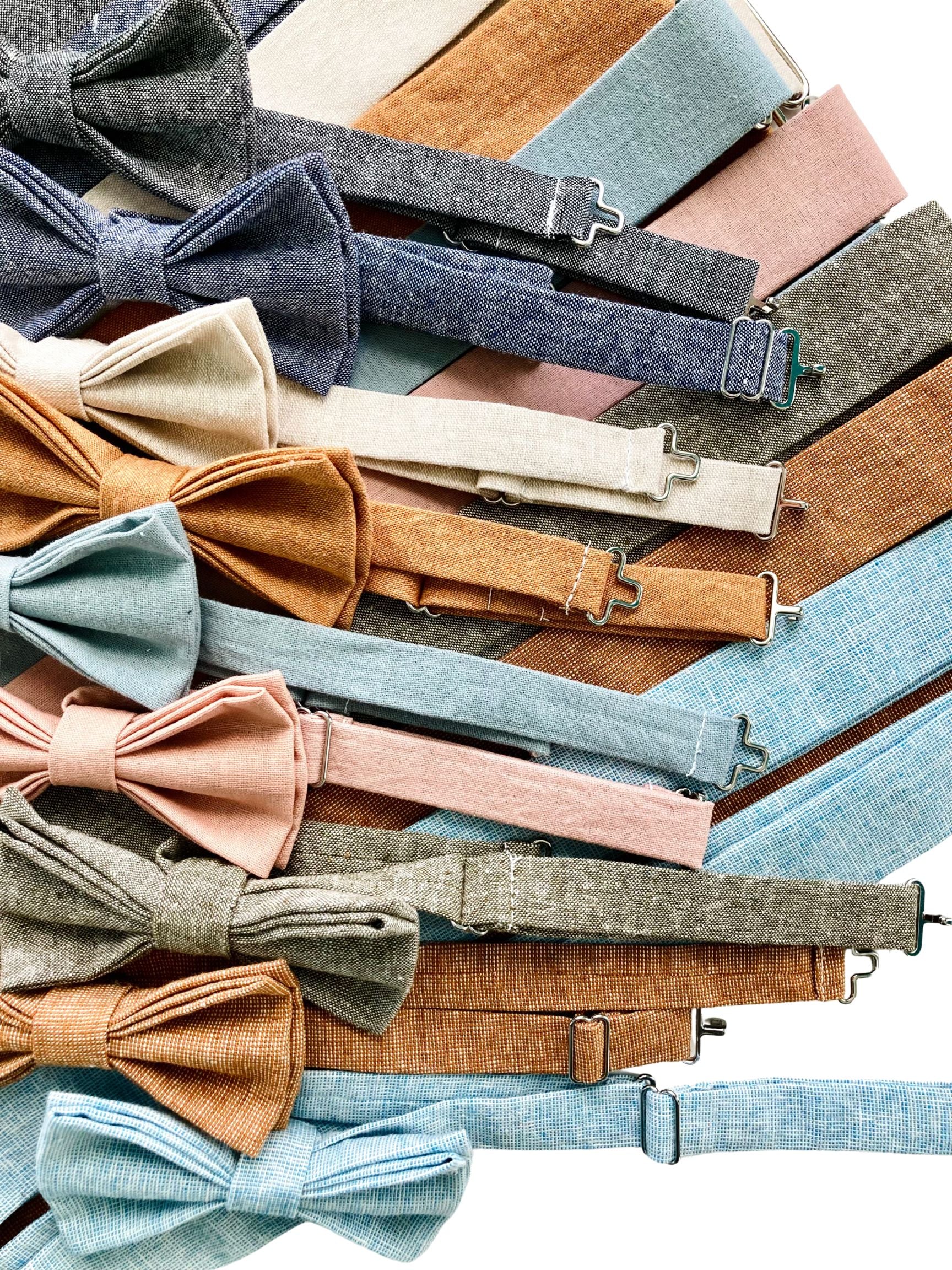 Ivory Beige Linen Bow Tie and Button-On Suspenders