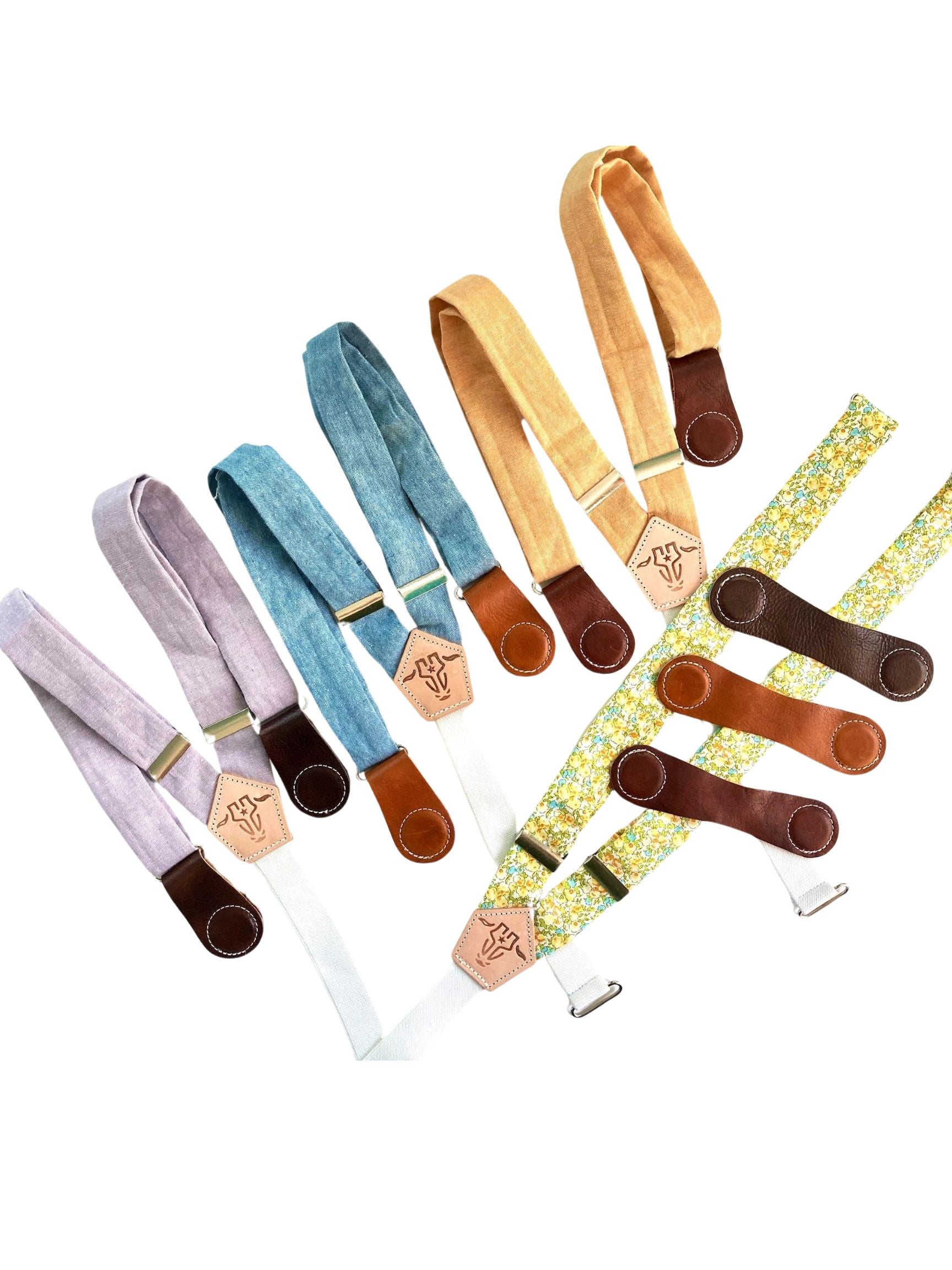 Say goodbye to clunky clips. Our patented magnetic leather clasps offer unmatched convenience with a secure, easy-to-use hold. Handcrafted from full-grain leather and available in Cognac, Tan, or Chocolate, these smooth leather attachments provide a beautiful contrast to the soft lavender linen while keeping your suspenders comfortably in place.