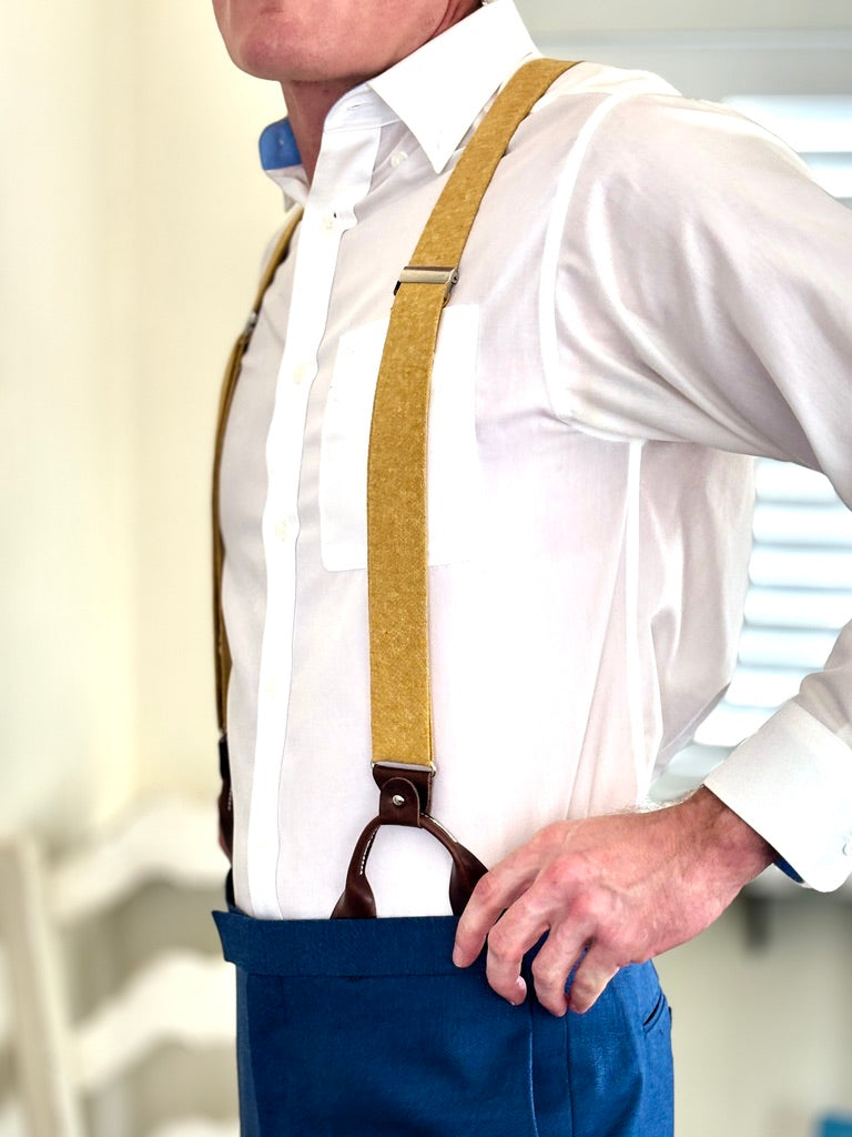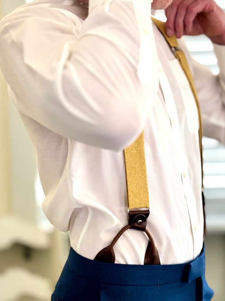 Marigold Yellow Linen Wedding Suspenders – Handmade Button-On Braces for Grooms & Groomsmen
