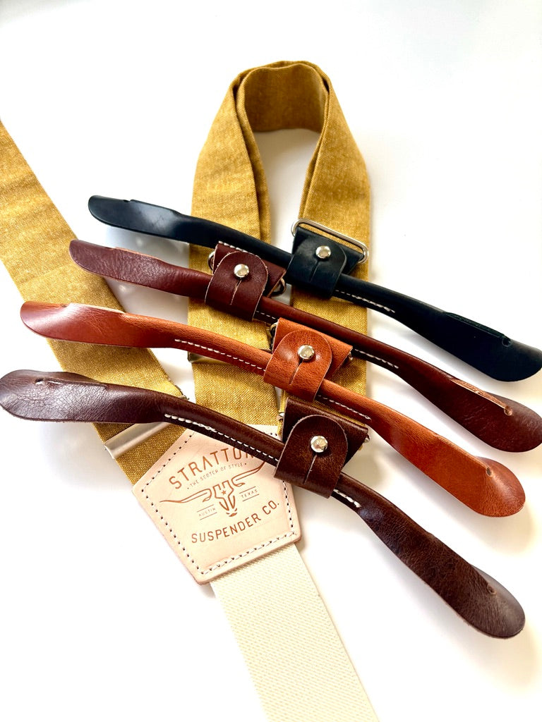 • Interchangeable Strap System – Expand your collection by swapping out suspenders straps without replacing the leather attachments.